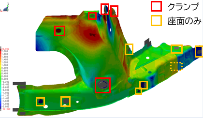 バーチャルCFでは、治具によるクランププランを仮想空間上で検証できます。どの位置を基準に、どのような順序でクランプすれば自重たわみを抑制できるかを解析し、最適な計測条件を事前に確認することが可能です。