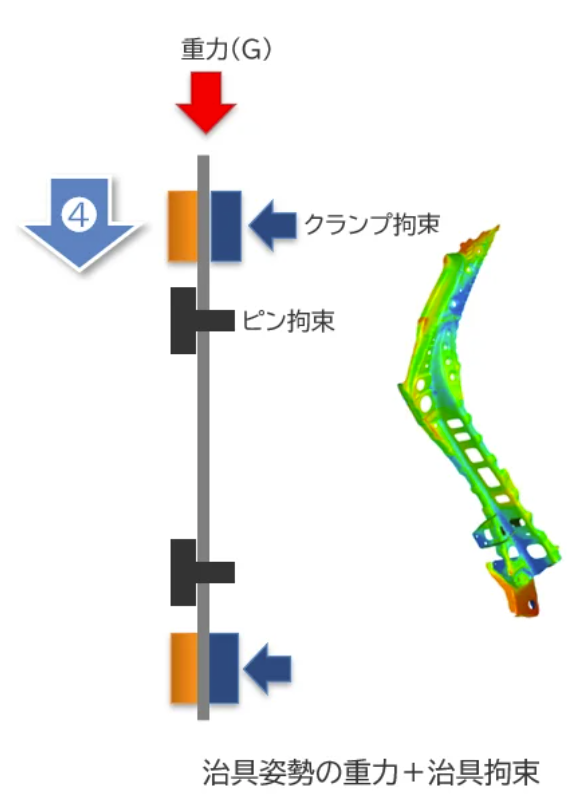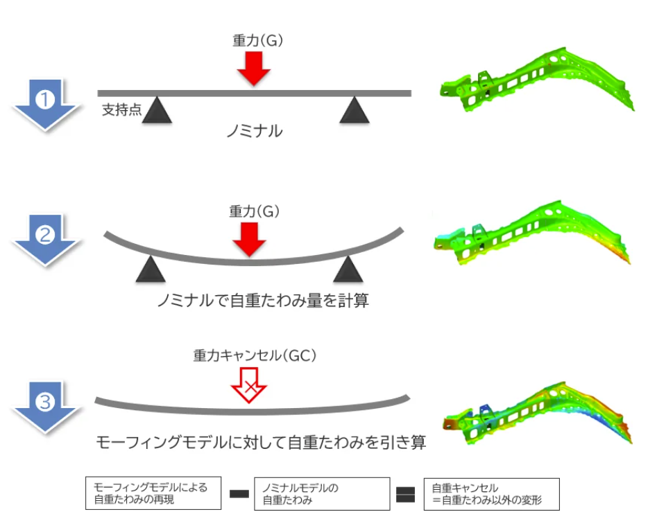 下図は、重力補正から仮想クランプに至るまでの解析手順を概念的に示したものです。部品がどのように補正され、仮想的に固定されるのかを順を追って確認できます。
