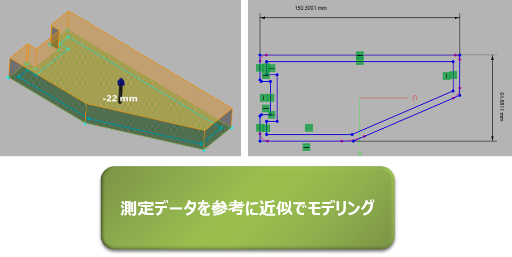 ソリッドモデリングでは、まず測定した三次元データの断面を切り、その輪郭の折れ線に対して自動でスケッチします。ただし、自動スケッチがうまくいかなかった箇所は手動で線を作成する必要があります。